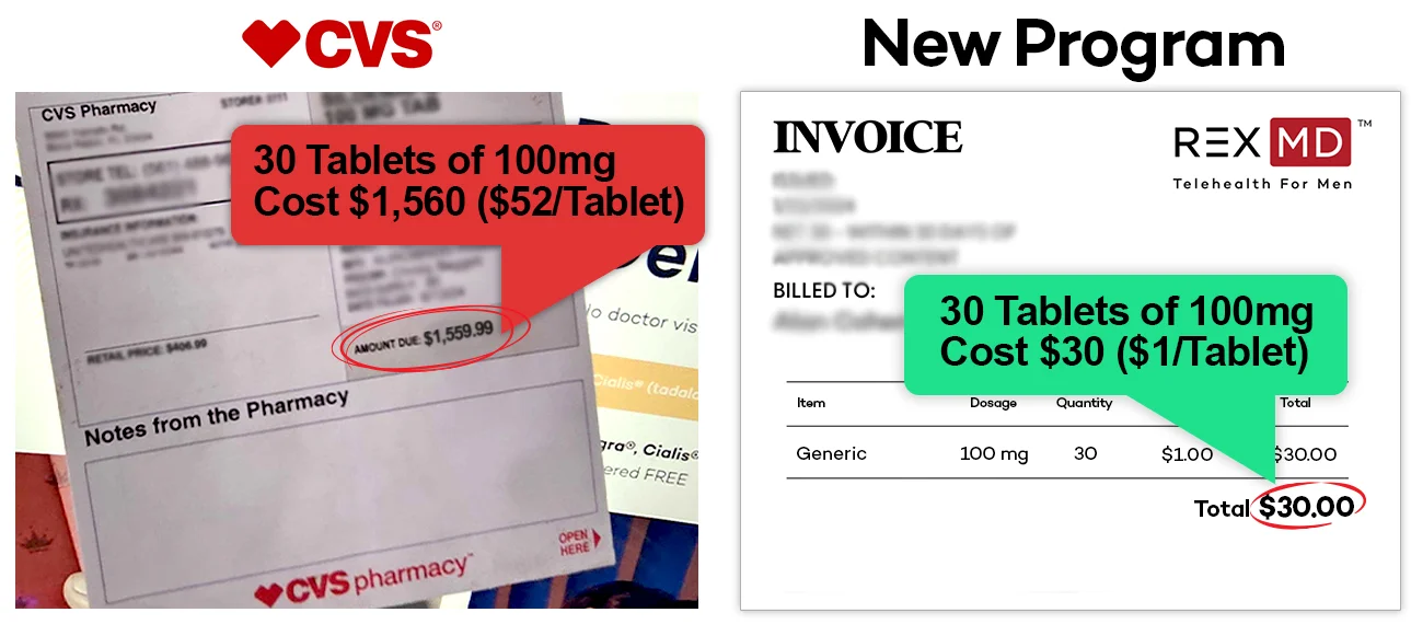 With Rex MD, patients are able to save $43 on each 100 mg Generic Viagra tablet and $50 on each 20 mg Generic Cialis tablet compared to CVS because CVS's retail prices are $45 and $52 respectively vs. just $1.00 for Rex MD.