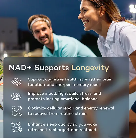 As we age, stress and lifestyle choices accelerate the natural decline of NAD+ levels. Restoring NAD+ powers essential cellular processes that keep our muscles, brain, and immune system functioning strong and balanced.