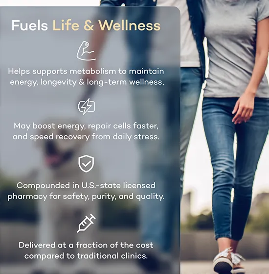 Boosting NAD+ helps support cellular energy production, which may improve overall performance and daily function. Research has linked NAD+ to benefits such as better mobility, reduced inflammation, and improved quality of life.